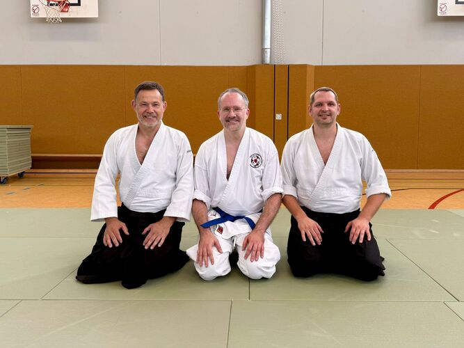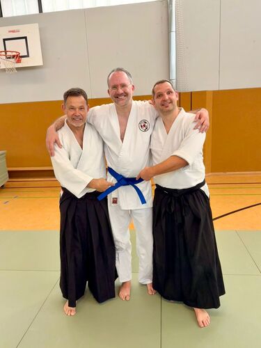 Die Krone jeder Blaugurtprüfung schließlich ist das Randori (freier Angriff): Eine Minute lang musste Christian ein Dauerfeuer von Dietmars Angriffen spontan in sinnvolle Techniken umwandeln. Auch dies gelang ihm hervorragend.